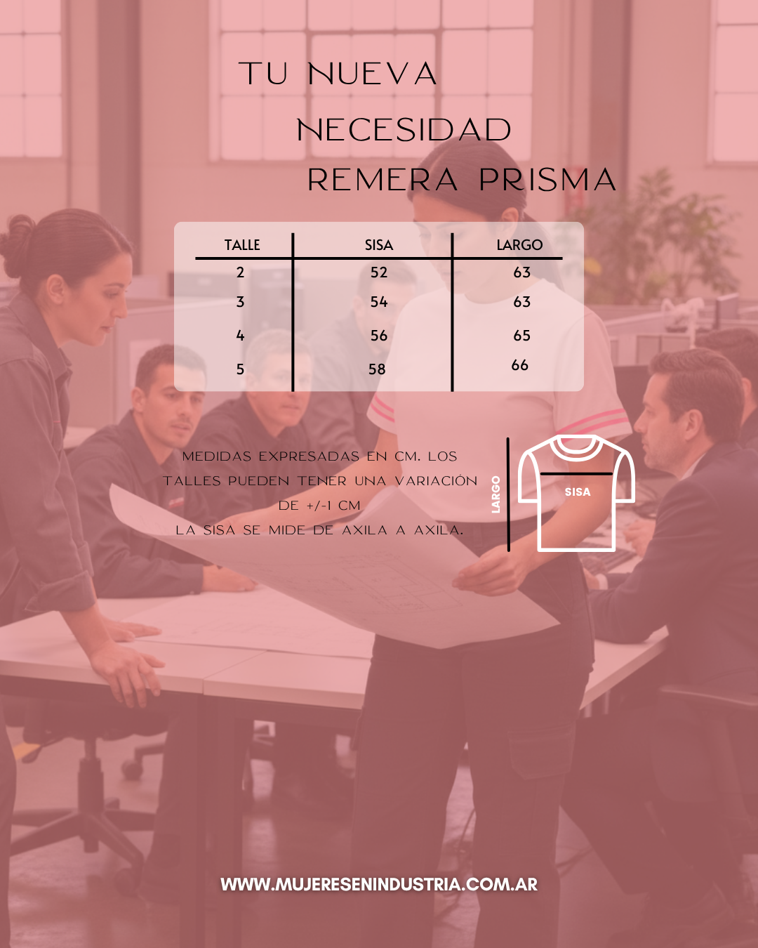 La Remera Prisma es una prenda diseñada para sobresalir, con un tono rosa chicle que agrega un toque vibrante y único al entorno industrial. Su nombre, Prisma, simboliza la capacidad de transformar y reflejar la luz en distintos colores, así como MEI busca representar la diversidad y fuerza de las mujeres en la industria. Esta remera, disponible en manga larga o corta, es ideal para cada temporada, fusionando moda y funcionalidad para el día a día laboral.