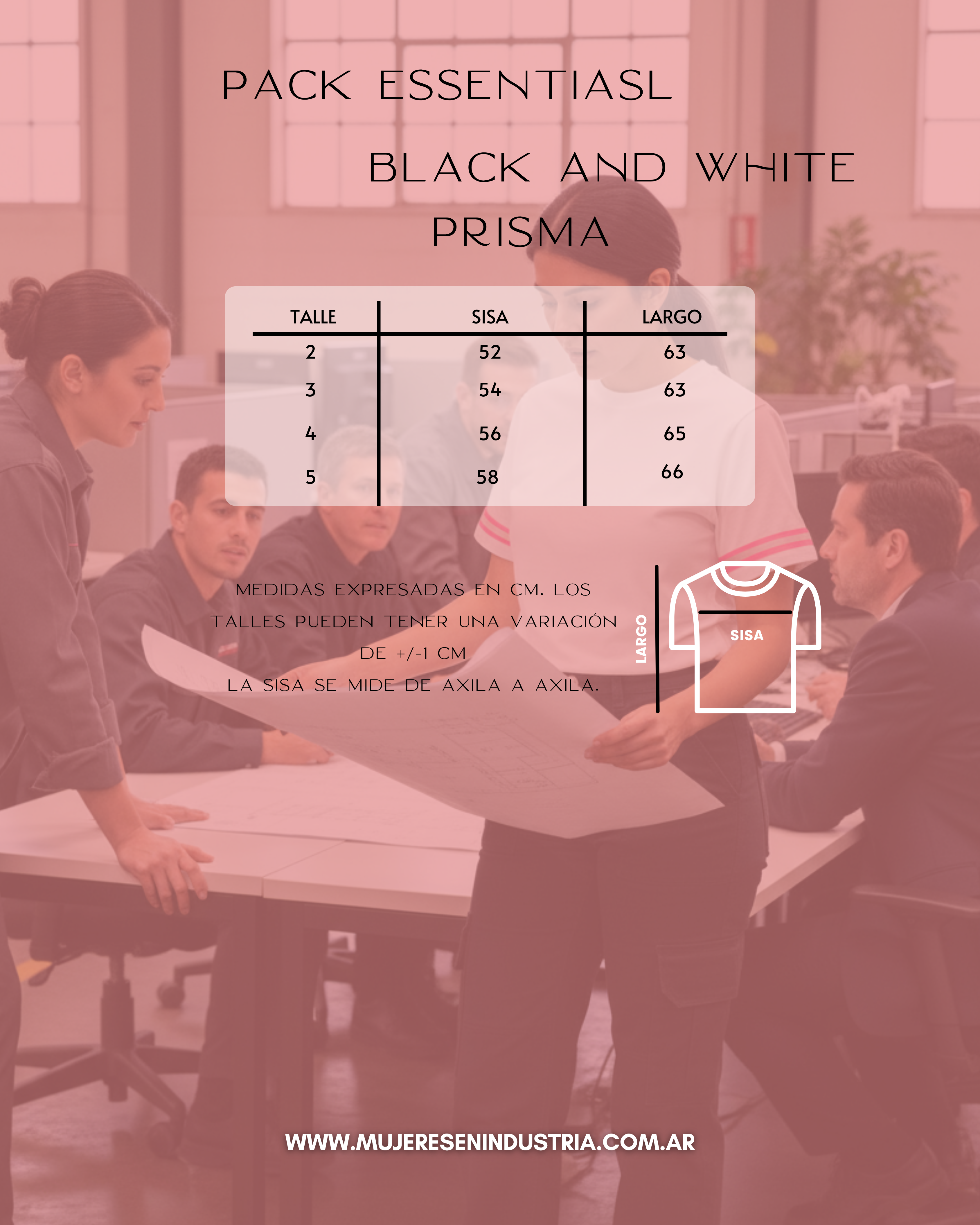 El Pack Essentials reúne las dos versiones más versátiles de nuestra remera Prisma: blanco y negro. Diseñadas para mujeres que trabajan en la industria, se mueven por la ciudad o lideran equipos, estas prendas combinan diseño funcional, estilo minimalista y el sello distintivo de MEI.